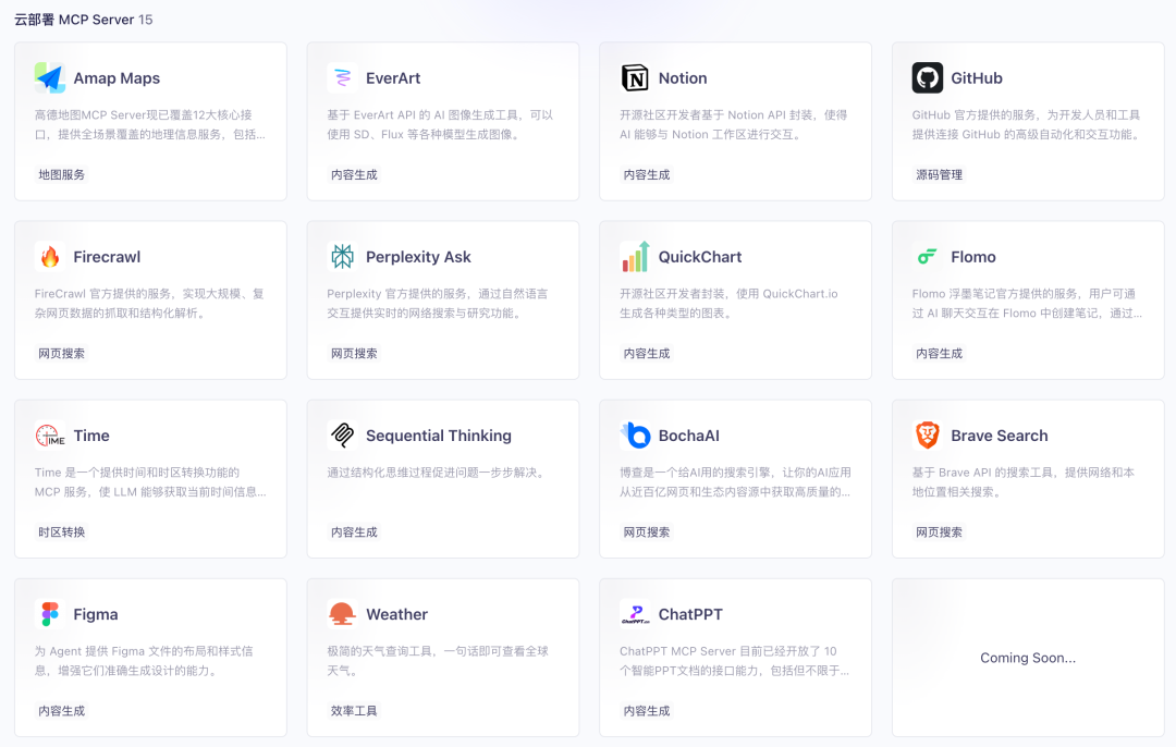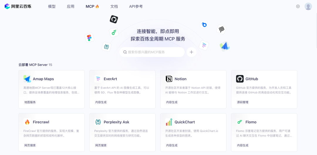 目前,百炼已经上线了 15 款 MCP 的云服务,并提供了 61 款社区 MCP 的介绍,更多的还在路上。