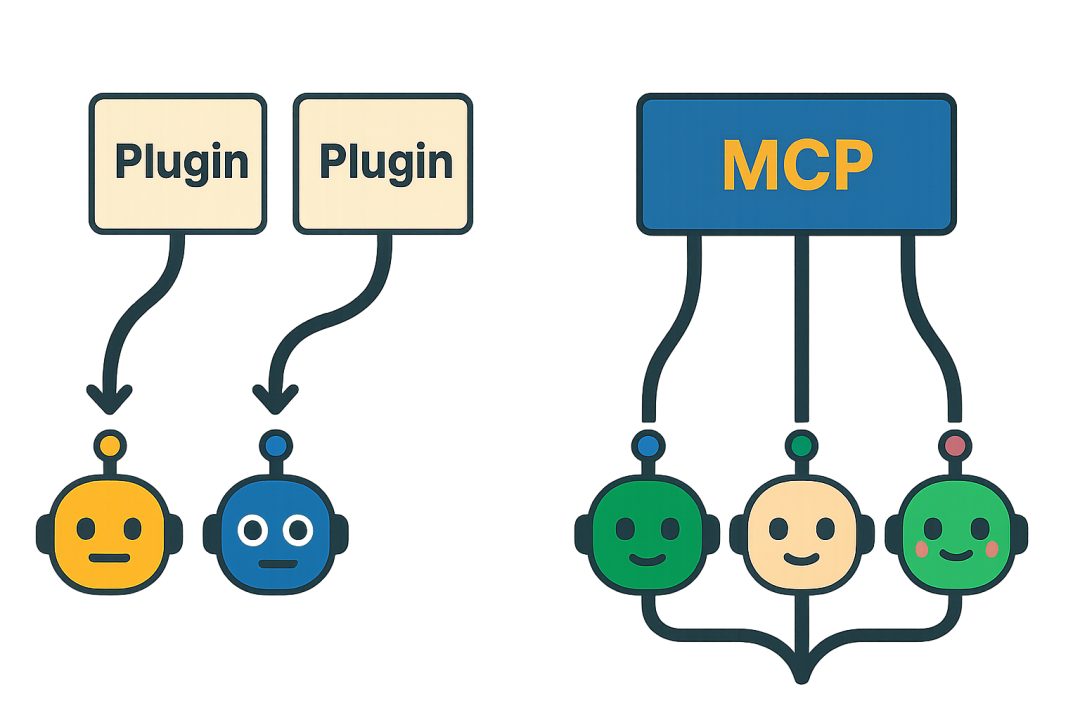 Plugin 是为某个模型写的私有接口描述;MCP 是跨模型、跨平台可复用的通用协议。