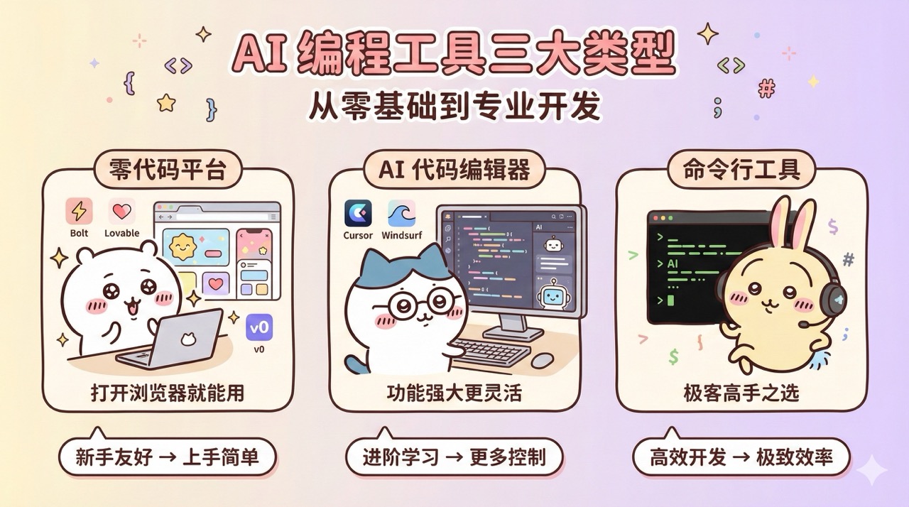 在前面的文章中,我们系统学习了 AI 编程工具的各个类型:从 AI 模型选择、零代码平台、AI 代码编辑器、命令行工具、IDE 插件、AI 智能体平台,到辅助工具集。