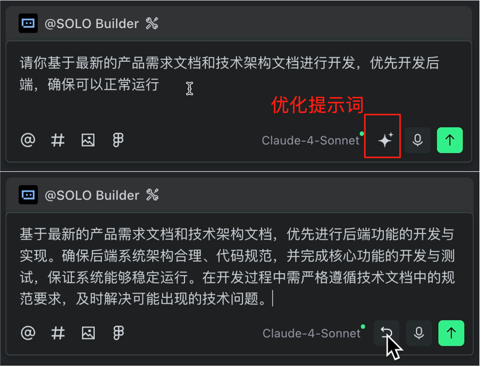 我们可以使用 TRAE 提供的 Prompt 优化功能来一键优化提示词。