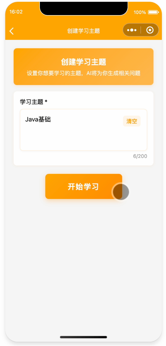 打开小程序,可以看到界面非常简洁、有活力。点击开始学习,然后输入你想学习的任何主题,比如 Java 基础。