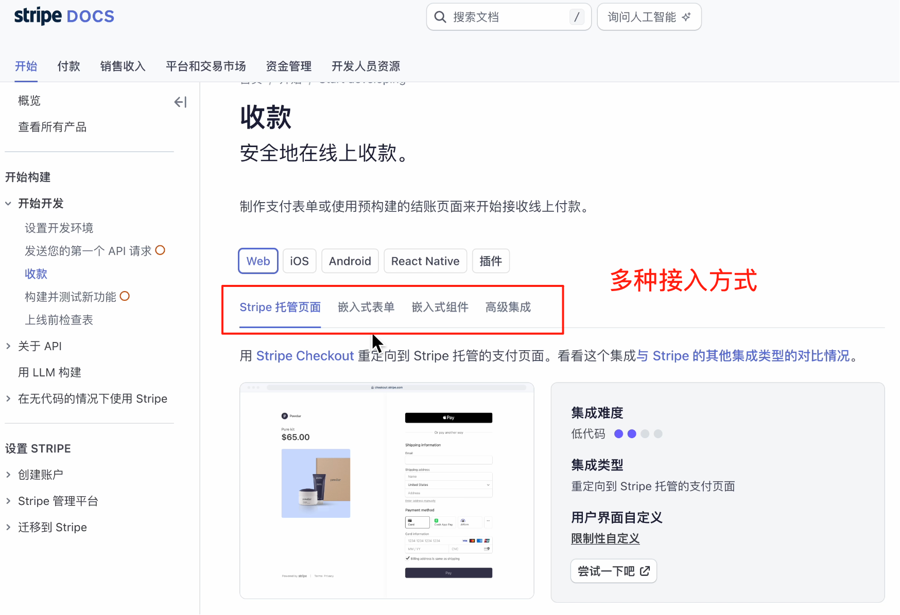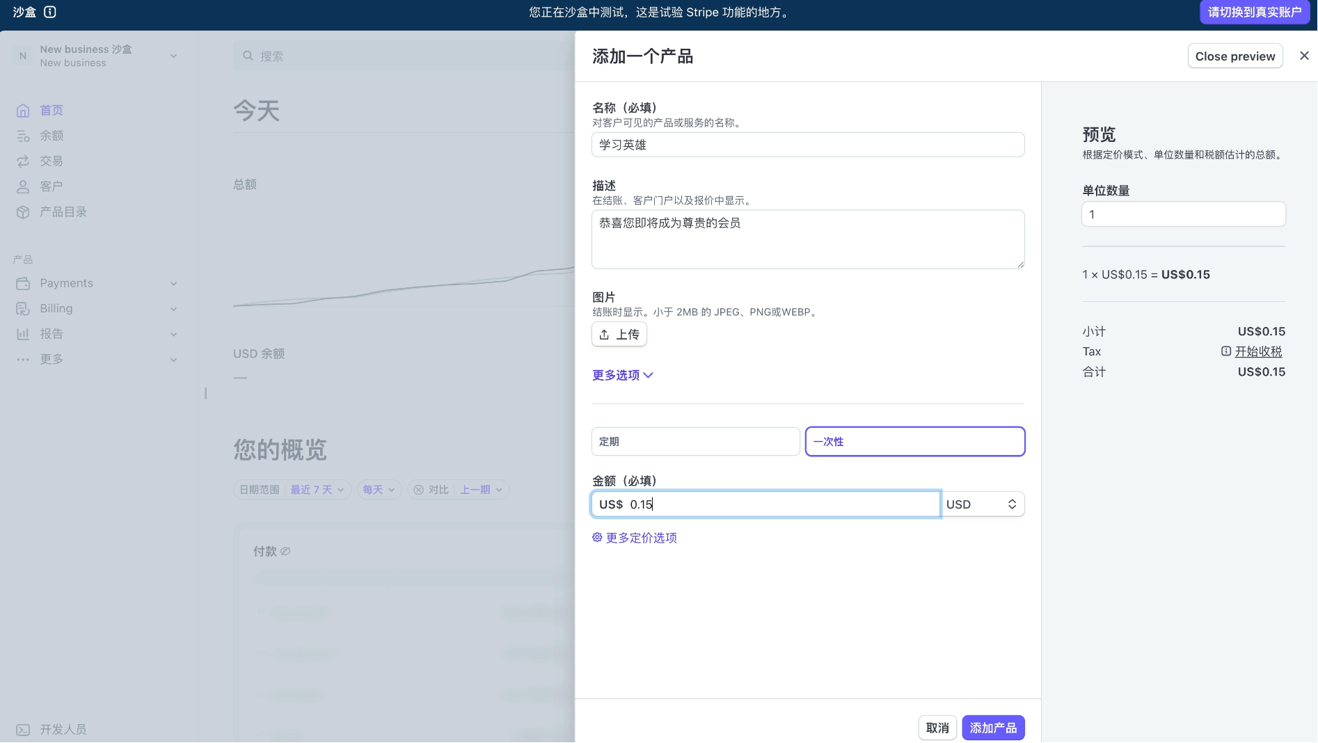 只需要先到官网注册账号,它会自动给你提供一个沙盒测试环境、以及对应的 API 密钥,你可以创建自己的产品并设置定价。