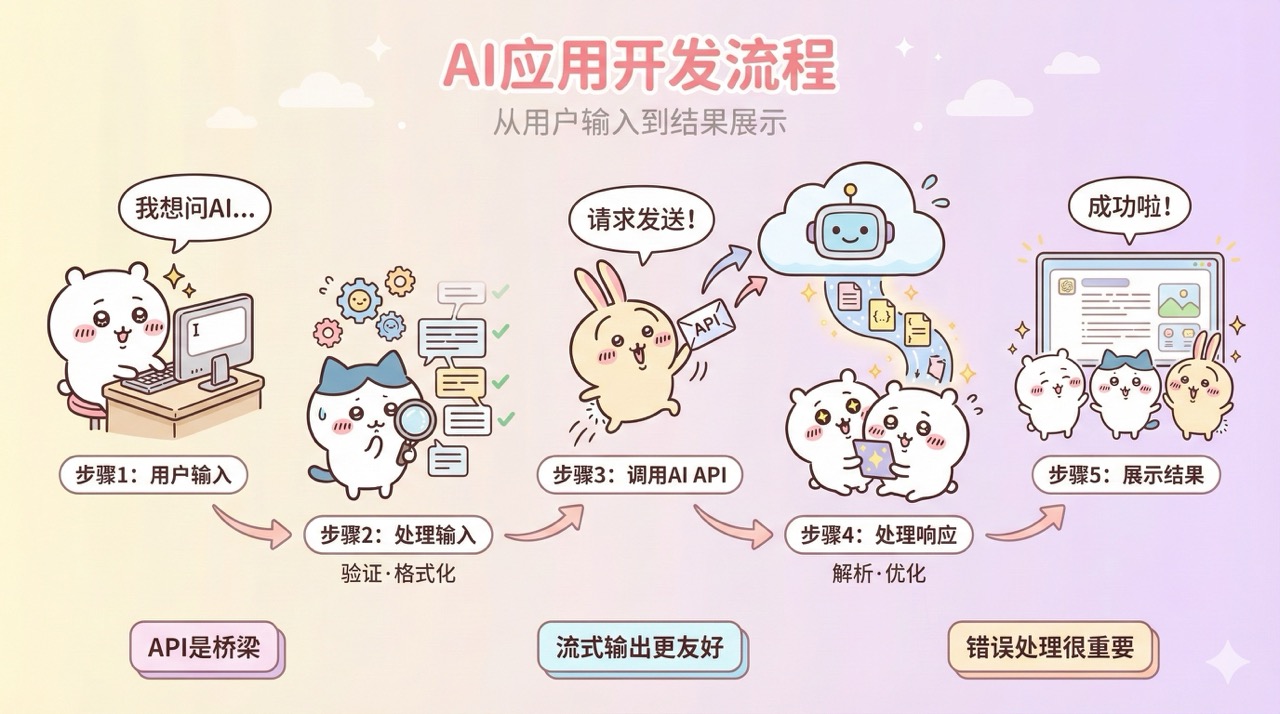 AI 应用的开发流程和普通应用类似,只是多了一个调用 AI API 的步骤。整个流程是:用户输入 → 处理输入 → 调用 AI API → 处理 AI 响应 → 展示结果。