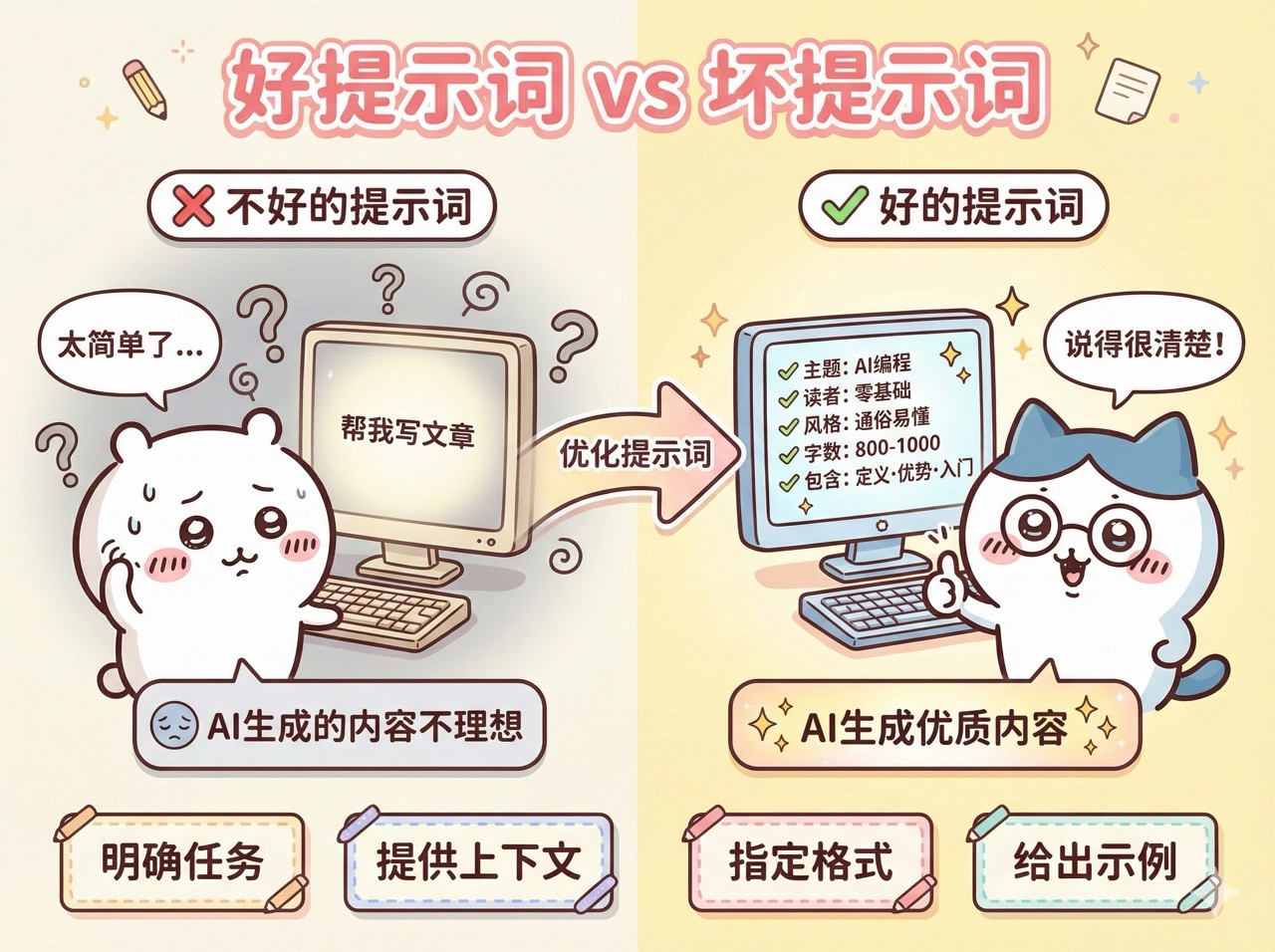 图片生成的质量很大程度上取决于提示词。一个好的提示词通常包含这些元素:主体(画什么)、动作或状态(在做什么)、环境背景(在哪里)、风格(什么风格)、光线(什么光线)、色彩(什么色调)、质量词(高清 / 4K 等)。