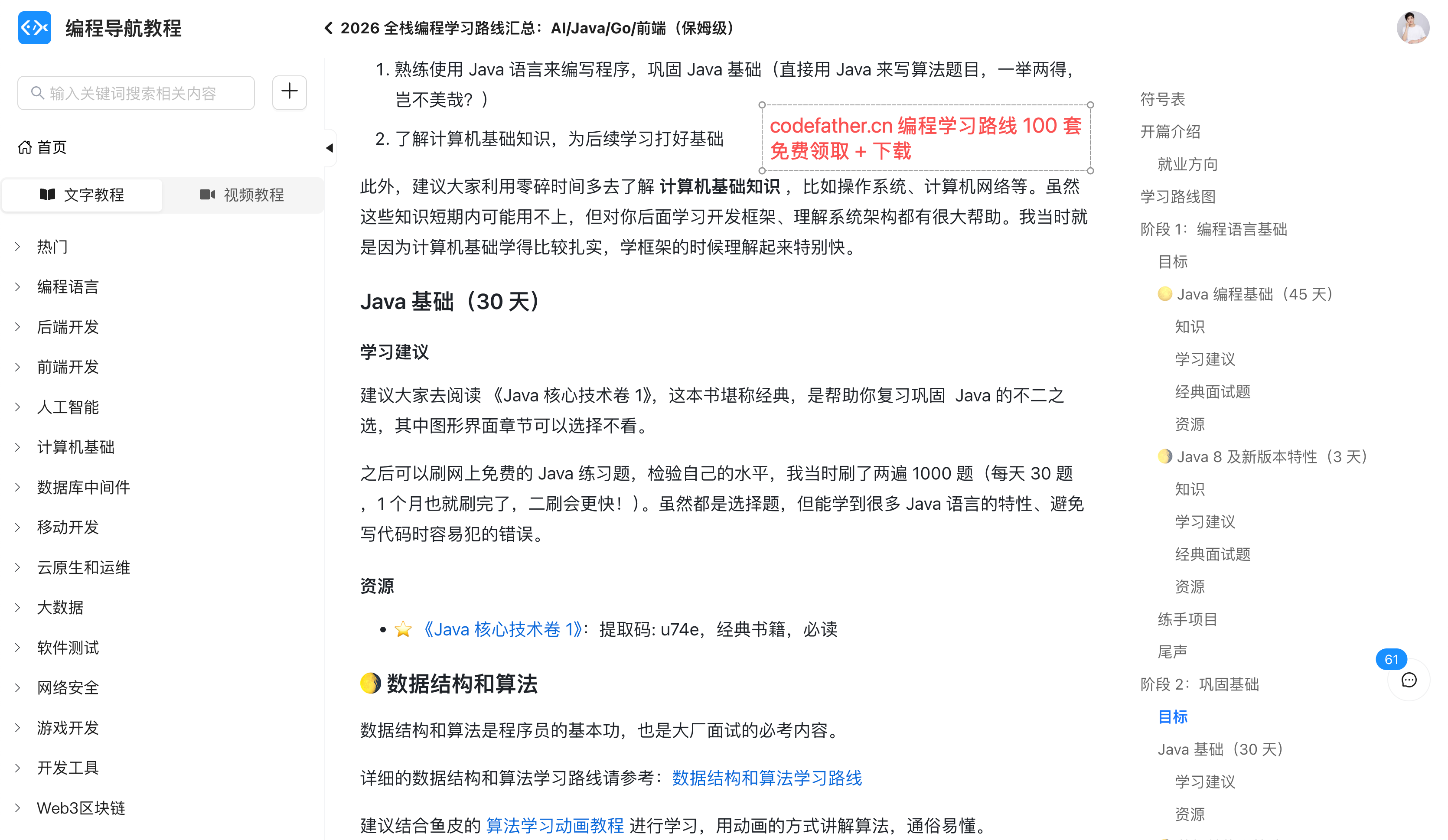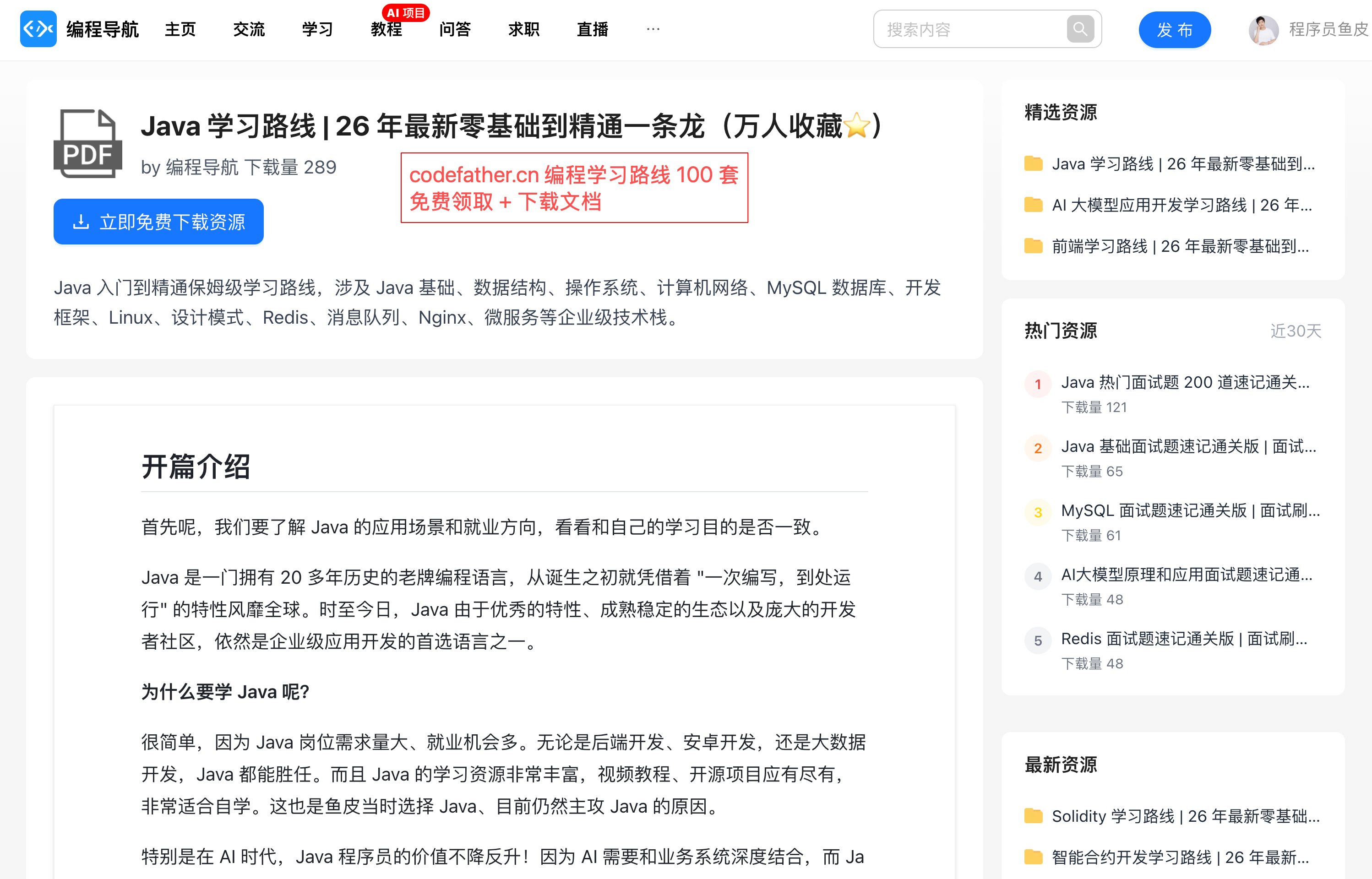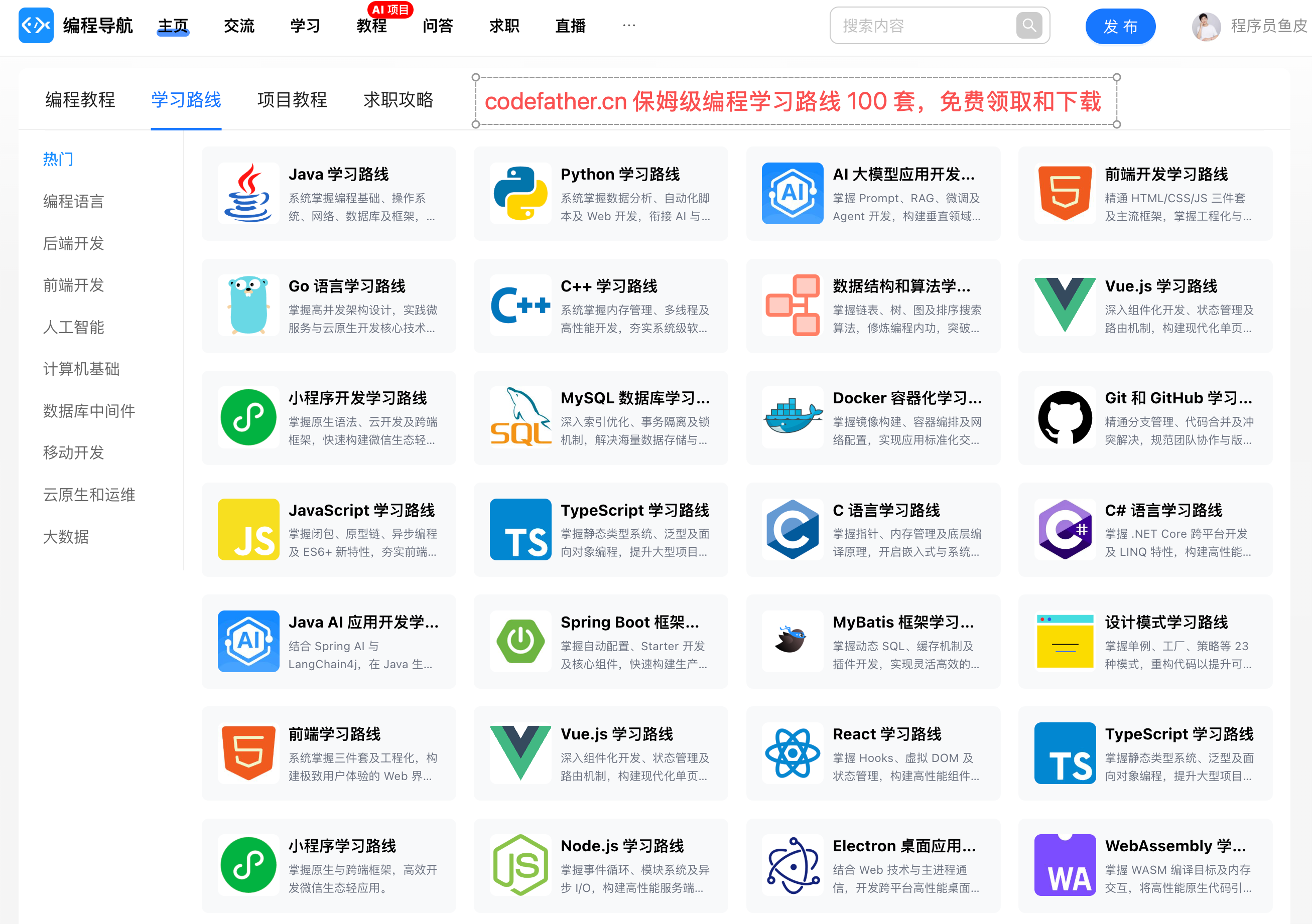 不管你是想学 Java、Python、前端,还是想入门 AI 开发,都能在编程导航找到适合自己的学习路线。而且所有路线都是免费的,还支持下载到本地。
